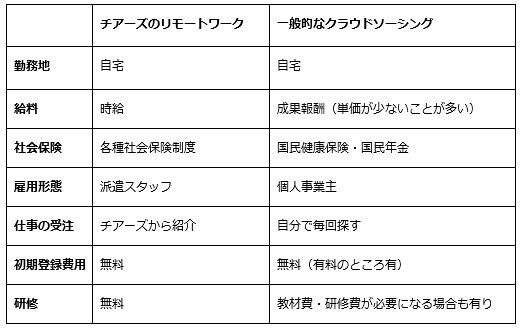 在宅で仕事ができる点だけ見ると、チアーズと一般的なクラウドソーシングは同じですが、ママにうれしい働き方ができるのはチアーズのリモートワークだけです。チアーズが提案するリモートワークはクラウドソーシングとは違い、安定的に収入を確保できる利点があります。