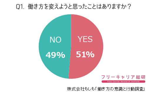 「働き方を変えようと思ったことはありますか?」と質問したところ、「YES」と回答したのは51%を占める369名。「NO」と回答したのは49%の351名と、意見が半分に分かれる結果でした。2人のうち1人は今の働き方を変えようと思ったことがあり、働き方の見直しをしていることが伺えます。