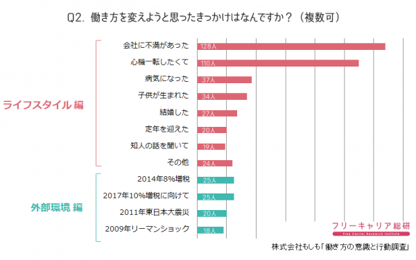 Q1の質問で「働き方を変えたい」と回答した人に「働き方を変えようと思った“きっかけ”はなんですか?」と質問したところ、ライフスタイル編では1位に「会社に不満があった」がランクインし、現状を打破したいと考える人が多いことがわかります。2位は新しいことにチャレンジしたいという思いから「心機一転したくて」がランクイン。3位は「病気になった」というやむを得ない事情がきっかけとなっている人がいることが分かります。また外部環境編では「2014年8%増税」と「2017年10%増税に向けて」が同率1位という結果でした。安倍政権の経済政策がきっかけとなり、影響を与える要因となっていることが伺えます。