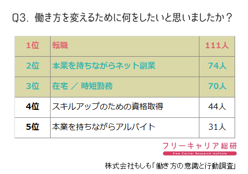 ◆ 働き方を変えるためにしたいこと1位は王道の「転職」2位以下は社会トレンドを反映。