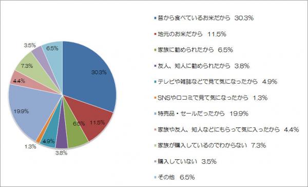 お米を購入したきっかけでは「昔から食べているお米だから」が30.3%と慣れ親しんだ味のお米を購入する人が最も多かった半面、「特売品・セールだったから」の回答が全体の約2割を占め、お米は何でもいいと考えている人も多く、二極化していることが分かりました。