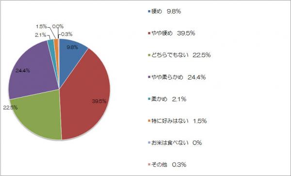 お米の好みの硬さは「やや硬め」と回答した人が全体の約4割を占め、「硬め」「やや硬め」で約半数の人が硬め派だということが分かりました。