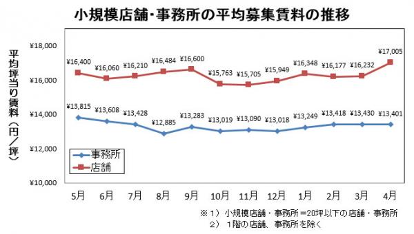 小規模店舗(20坪以下)の平均募集賃料は、前月から4.8%上昇し、坪当たり1.7万円台へ大幅に上昇しました。