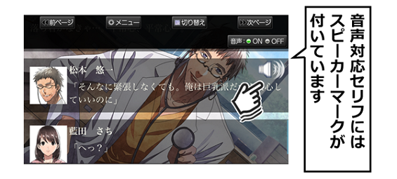 従来の「絵ノベル」の動きに加え、キャラクターの音声やBGMを追加することにより、より臨場感が増したクオリティーの高いコンテンツとしてお楽しみいただけます。