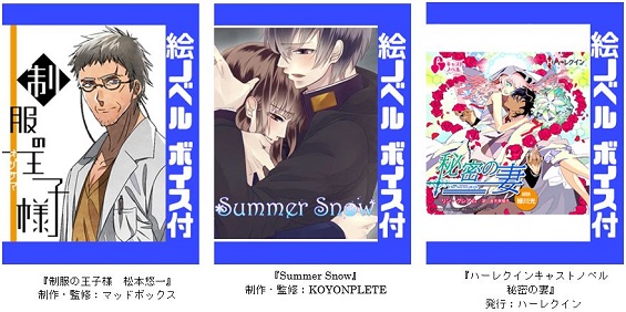 第一弾として、13万DLを突破した日本初の“枯れ専”(オジサマ好き)乙女ゲーム『制服の王子様 松本悠一』(株式会社マッドボックス)、『Summer Snow』(KOYONPLETE)、『ハーレクインキャストノベル 秘密の妻』(株式会社ハーレクイン)の3作品をリリースいたします。藤原啓治氏、緑川光氏といった人気声優のボイスが収録されています。
