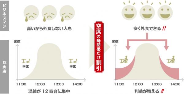 オフィス街では、多くのビジネスマンが外食を高いと感じる一方で、多くの飲食店が12時台に混雑し、13時を過ぎれば空席が目立ちます。そこで、飲食店がそれぞれ集客したい時間帯だけ割引できるプラットフォームを作り、各店の割引状況がひと目で分かるようスマートフォンアプリに集約しました。