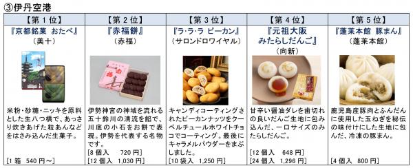 定番土産の『おたべ』と『赤福』が1位と2位に。和菓子がトップ5に3つもランクインしていますが、ピーカンナッツをホワイトチョコレートなどで包んだ『ラ・ラ・ラ ピーカン』が3位に入りました。[伊丹空港担当談]
