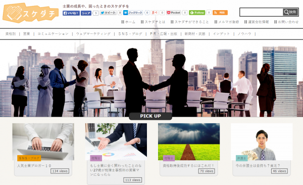 「スケダチ」では、この名前の意味する【助太刀】をモットーに、士業を対象にした最新の独立支援情報、助成金情報、インキュベーション情報、投資情報、集客情報、マーケティング情報など、ありとあらゆる支援情報を、毎月30本以上の記事やコンテンツと共に、ご提供して参ります。