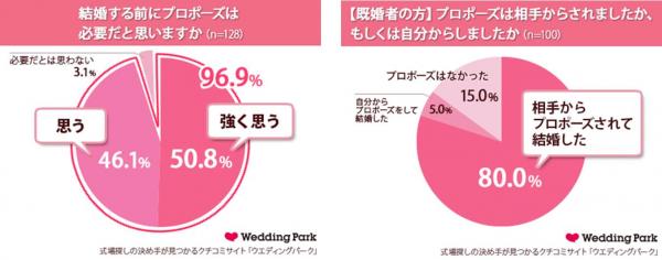 結婚式場の日本最大級のクチコミサイトを運営する株式会社ウエディングパーク(本社:東京都港区、代表取締役社長:日紫喜 誠吾 以下ウエディングパーク)は、自社が運営する、大人女子のトレンド研究所「ガールズスタイルLABO(GSL)*1」にて、20代~30代の女性128人を対象に「プロポーズ」に関する調査を実施致しました。