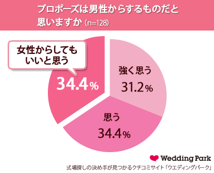 また『プロポーズは男性からするものだと思いますか(単一選択)』という質問をしたところ、「強く思う(31.2%)」、「思う(34.4%)」と、合わせて6割以上の女性が、「一生に一度のプロポーズには男性にリードされたい」という憧れが根強くあることがわかり、一方で、女性からプロポーズをする「逆プロポーズ」でもいい、と答えた人は34.4%で、3人に1人の女性が逆プロポーズ支持派であることがわかりました。