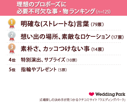 『あなたの理想のプロポーズに必要不可欠なものを1つだけ選んでください(単一選択)』という質問をしたところ、圧倒的な投票数を集め1位になったのが「明確な(ストレートな)言葉」となり、2位が「思い出の場所、素敵なロケーション」、3位が「素朴さ、カッコつけない事」という結果となりました。