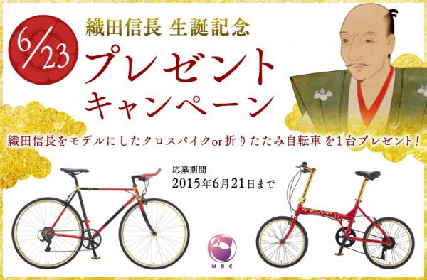 京都発、自転車製造・販売を行う株式会社MBC(本社:京都市、代表:伊澤慎一)は、今春4月に発売した新自転車のプロモーションとして、織田信長の誕生日である6月23日を祝して、織田信長をテーマとした自転車Azuchiシリーズ「AZ7」「ck2」が当たるプレゼントキャンペーンを2015年5月23日より開催中です。