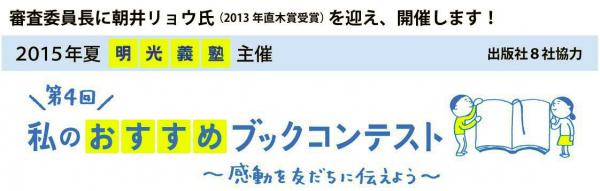 個別指導塾「明光義塾」を全国展開する株式会社明光ネットワークジャパン(本社:東京都新宿区、代表取締役社長:渡邉 弘毅、東証第一部:4668)は、明光義塾主催「第4 回 私のおすすめブックコンテスト」を2015 年7 月1 日(水)より実施いたします。