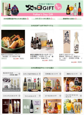 2015年の父の日特集は、「田中太山の名入れラベル日本酒・焼酎」「スタッフオススメセット」など父の日限定品・セット品を集めた8カテゴリと、定番の「グルメ・スイーツ」「焼酎・日本酒」「シャンパン・ワイン」など12カテゴリで構成されています。