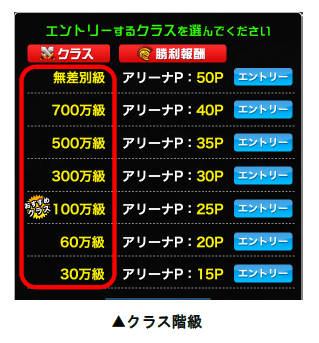 バトルエントリー時に、戦闘力別に階級分けしたクラスを選択すると、