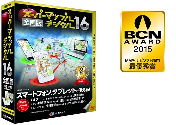 「スーパーマップル・デジタル」は豊富な情報と多彩な機能を備えたインストール型 PC 用地図ソフト。家電量販店やパソコンショップなどの販売実績に基づいてカテゴリー毎の実績をランキング発表する「BCN AWARD 2015」、MAP・ナビソフト部門で [最優秀賞] を受賞した 業界 No.1 の人気商品です。