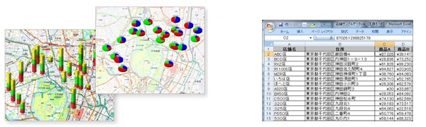 手持ちの顧客管理情報など、所有の Excel データを地図上に展開し、グラフとして表示できます。