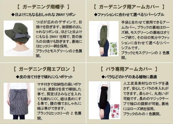 「ウィズガーデン プレミアムシリーズ」の新商品、帽子、エプロン、アームカバーは全てUVカット、防虫加工を施しており、丸洗いも可能です。お客様の声を取り入れたデザイン性と機能性に優れた商品で、同シリーズの手袋と合わせてトータルコーディネートが楽しめます。