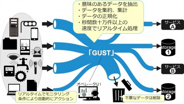 ビッグデータ(※1)の活用がビジネスで不可欠になっていますが、スマートデバイスやIoT(※2)の普及によりデータ量は爆発的に増加しており、「データが大きすぎて保存できない」、「分析に時間がかかる」といった問題が生じています。ストリームデータ処理ツール「GUST」は、ビッグデータをリアルタイムに処理することでこれらの課題を解決します。