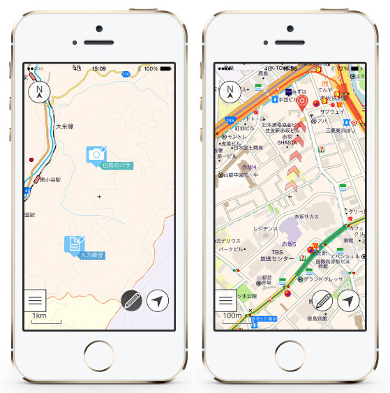 また、オフラインでのGPSログ取得など従来からの機能も充実しています。地図表示は各端末に最適なデザインを自動で表示いたしますので、常に見やすい地図をご覧いただけます。