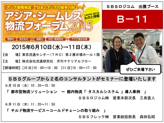 SBSグループにおいて物流事業の中核を担うSBSロジコム株式会社は、6月10日から11日の2日間、アジア各国とのシームレス物流の実現に向けて様々な取り組みが紹介される「アジア・シームレス物流フォーラム2015」(株式会社流通研究社様主催)に初めて出展いたします。