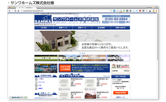 サンワホームズ株式会社様は東京都目黒区碑文谷で、建売物件の賃貸、売買の仲介、斡旋、投資用物件のプロデュースなど不動産取引運用に関わる各分野の専門家とタイアップし総合的なコンサルティングセールスを展開する不動産会社です。