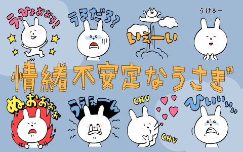 「情緒不安定なうさぎ」は弊社オリジナルのスタンプです。ウサギをモチーフに、少しオーバーなくらいに全身を使って全力で感情を表現します。喜ぶときも悲しむときも全力。感情の浮き沈みがはげしいウサギです。