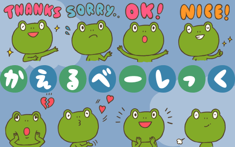 「かえるべーしっく」は弊社オリジナルのスタンプです。カエルをモチーフにしたベーシックなスタンプです。過去リリースしたスタンプの傾向を参考に、使用頻度の高い内容のスタンプを中心に作成しました。