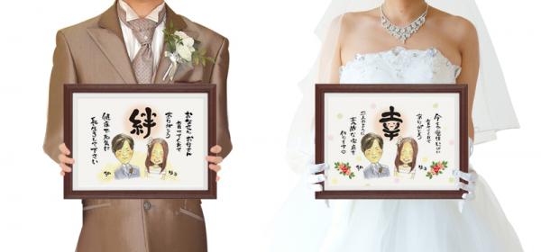 結婚式の両親のプレゼントや誕生日プレゼント、還暦祝い等に、そっくりな似顔絵と感謝の気持ちを伝える筆文字を組み合わせて作る似顔絵サンクスボードです。主な特徴として下記があります。