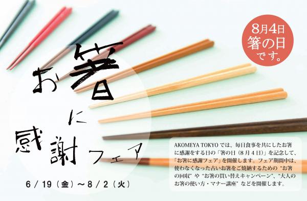 株式会社サザビーリーグ(本社:東京都渋谷区千駄ヶ谷/代表取締役社長 森 正督)が運営する、「お米」を中心としたライフスタイルショップ ブランドAKOMEYA TOKYO(アコメヤ トウキョウ)は、毎日食事を共にしたお箸に感謝をする日の「箸の日(8月4日)」を記念して、6/19(金)~8/2(日)の期間中、「お箸に感謝フェア」を開催します。
