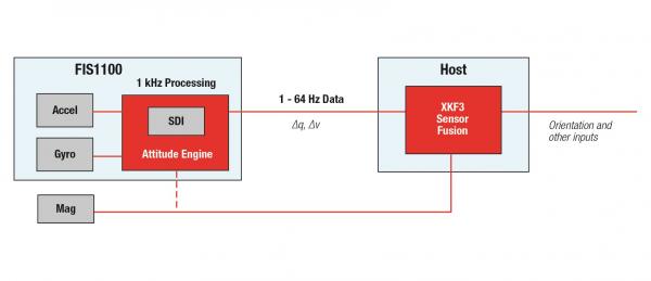 「FIS100」に内蔵された「AttitudeEngineモーションプロセッサー」は6軸慣性データを内部で高速処理した上で、アプリケーションのニーズに合わせてホストプロセッサーへの出力を低速で行うため、割り込みの頻度を激減できます。 その結果、システムプロセッサーのスリープモード時間が延長されるため、機能や精度を犠牲にすることなく、民生機器等でのバッテリー寿命を延長できます。さらに、 同時提供の「高性能9軸(XKF3)センサーフュージョン」アルゴリズムは、「FIS100」内の3軸加速度センサーと3軸ジャイロセンサーのデータに、外付けの3軸地磁気センサーのデータを統合します。 「XKF3センサーフュージョン」には、精度、整合性、流動性の性能を高めるバックグラウンド・オートキャリブレーション機能も組み込まれています。 「XKF3センサーフュージョン」アルゴリズムと組み合わせることで、「FIS1100」は、ピッチ/ロール精度±3°、ヨー精度±5°の指向性(四元)スペックをワンパッケージ上で実現する世界初の民生用途向け慣性計測ユニット(IMU)です。