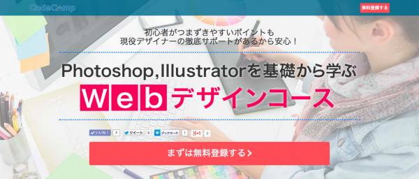 新設された全てのコースで、アドビ認定インストラクター監修によるCodeCamp完全オリジナルのカリキュラムを用いて、Photoshop 及び Illustrator の基本的な操作方法から、Webページを制作するにあたって必要な知識までを体系的に学ぶことで、Webデザインに必要なスキルを一から身に付けることができます。