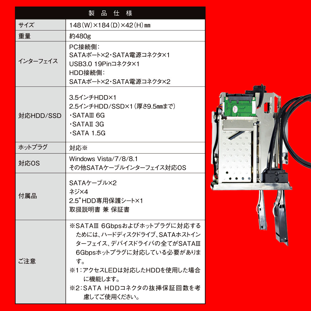 付属品 :SATAケーブル×2 ネジ×4 2.5インチHDD専用保護シート 取扱説明書 兼 保証書