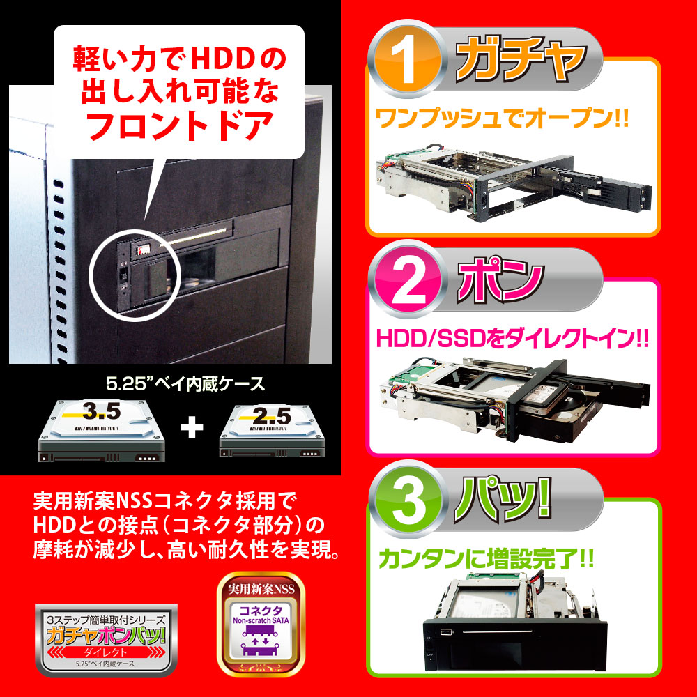 ガチャっとワンプッシュでオープン、ポンっとHDD/SSDをダイレクトイン、パッ!と増設完了で『ガチャポンパッ!』で簡単に増設できます。インナートレイがいらずダイレクトに入れられますので手間がかからずにすぐ接続することが可能です。またネジやドライバーなど工具も不要です。