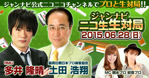 株式会社ウインライトが運営する本格オンライン麻雀アプリ「ジャンナビ麻雀オンライン」は、3月26日に独自のトイツ理論を繰り広げ数々のタイトルを制してきた土田浩翔プロと、「最速最強」多井隆晴プロとのニコ生生対局を行います。