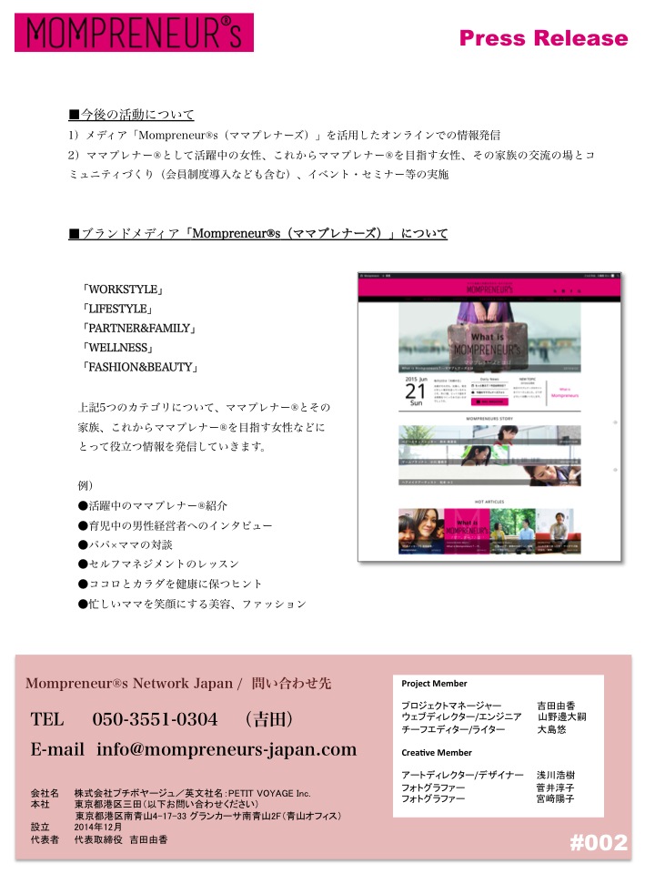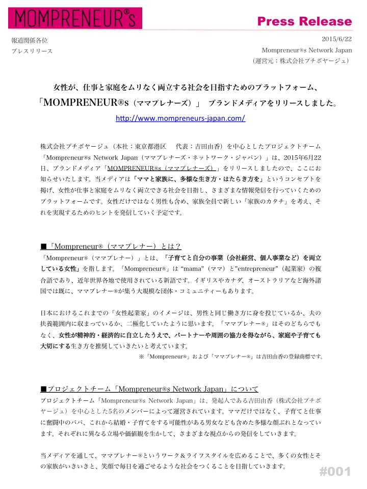 株式会社プチボヤージュ(本社:東京都港区 代表:吉田由香)を中心としたプロジェクトチーム「Mompreneur(R)s Network Japan(ママプレナーズ・ネットワーク・ジャパン)」は、2015年6月22日、ブランドメディア「MOMPRENEUR(R)s(ママプレナーズ)」をリリースしましたので、ここにお知らせいたします。当メディアは「ママと家族に、多様な生き方・はたらき方を」というコンセプトを掲げ、女性が仕事と家庭をムリなく両立できる社会を目指し、さまざまな情報発信を行っていくためのプラットフォームです。女性だけではなく男性も含め、家族全員で新しい「家族のカタチ」を考え、それを実現するためのヒントを発信していく予定です。