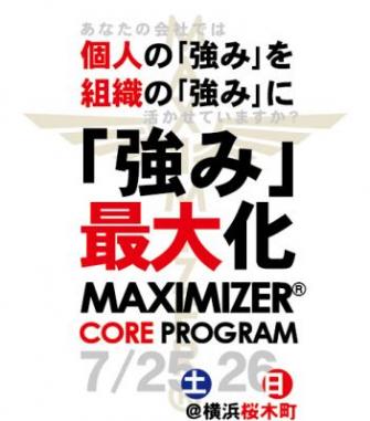MAXIMIZER(R)コア・プログラムは上記MAXIMIZER(R)システムの中核・基本となるプログラムです。 業種・業域・業務に関わらず、組織人として生きる全ての方を対象としており、それぞれの現時点での「強み」を明確化・最大化し、その「強み」を組織内外で発揮・活用できるようになることを目的としています。 また自身の学びと体験を通じ、チームのメンバー指導・部下育成への応用をはじめ、組織全体の活性化、機能向上、成果向上、他の効果も期待できます。