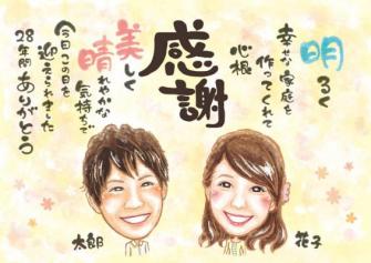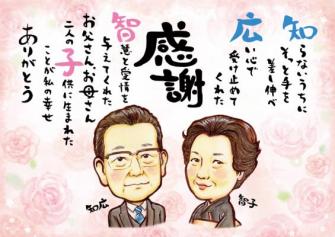 似顔絵名前詩は、両親や新郎新婦の似顔絵に、両親の名前を使った詩を組み合わせ、主に結婚式の両親贈呈品として利用できるオリジナルギフトです。従来よりあった似顔絵サンクスボードに新商品として似顔絵名前詩が加わったことにより、よりお客様の選択肢が増えました。名前詩という独自性の高い言葉を好む方や、メッセージを考えるのが苦手な方にご利用いただくことを想定しています。