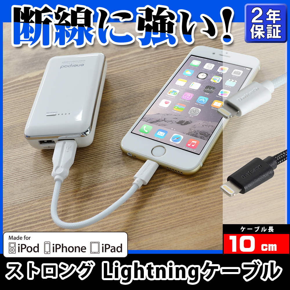 大好評いただいている『ストロング Lightningケーブル』に持ち運ぶときにかさばらない長さ10cmタイプを追加しました。外出時に鞄の中でモバイルバッテリーとつなげて充電するときや、カフェのテーブルの上でノートパソコンにつなげて使うときに便利な長さです。