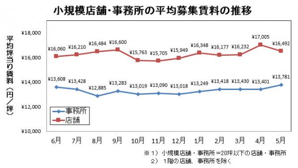 池袋の小規模事務所(20坪以下)の5月度平均募集賃料は、前月から2.8%上昇しました。