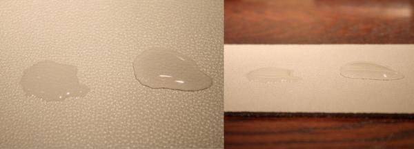 セミアニリン仕上げの皮革に防水スプレーをして水を垂らしてみると、スプレーをしていない面も水をある程度はじきますが、防水処理が施された面では水滴が綺麗な粒状になり高い防水効果を発揮します。
