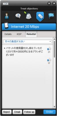 例えば、通信キャリアにおいて「解約したい」というお申し出を受けた場合、オペレーターが「解約希望」のボタンをクリックするとシステムが「ご解約の理由をお伺いしてもよろしいでしょうか?」の質問を促します。「月々の支払い負担が大きい」が理由の場合、今までのパケット通信量などのお客さまの利用情報、およびより安いプランを表示、「パケットの使用量を少し抑えていただくだけで月々○〇〇〇円になるプランがございます」などの勧誘話法を表示します。お客さまから「他社への乗り換え」を申し出られた場合は、乗り換え先のキャリア名をクリックすることで、該当する乗り換え防止キャンペーンの勧誘話法を表示するなど、さまざまな解約防止策を指示します。