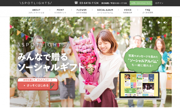 スポットライトは、インターネット上で友人を誘い合わせてお花を購入そのまま花束と共にソーシャルアルバムを贈るソーシャルギフトサービスです。