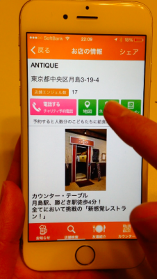 飲食店の予約サービスはこれまで一部の企業による寡占状態が続いていました。この市場に風穴を開け、新たな価値をつくるサービスが“社会貢献型飲食店検索アプリケーション”「テーブルクロス」です。消費者が「テーブルクロス」を通じて予約することによって、予約人数分と同じ数量の学校給食が 途上国の子どもたちへ届けられます。配給は途上国で活動するNPOを通じて行われ、10個のNPOと連携することが決まっています。(2015年6月現在)