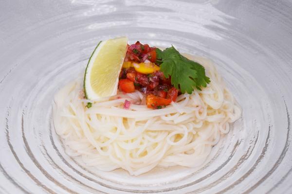 レコールバンタン カフェ&バリスタ専攻の学生26名は、6月3日(水)に行なったオリエンテーションの中で、タワーレコードのブランドや店頭向け企画、商品開発などの説明を受け、“NO SOMEN, NO SUMMER.”をテーマとして、夏フェスに向けた新しいフードとして、オリジナルそうめんの企画を開始。以降、学生たちはオリジナルそうめんのレシピ開発と試作と進め、6月24日(水)にタワーレコード渋谷店店長と担当者に向けて、試食会を実施。タワーレコード渋谷店店長や担当者からのアドバイスや意見を取り入れながら、オリジナルそうめんを完成させました。