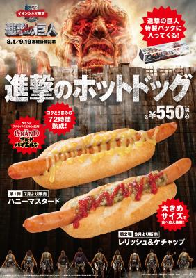 映画の連続公開に合わせ、ソースは第1弾「ハニーマスタード」に続いて、9月(予定)からは第2弾「レリッシュ&ケチャップ」が登場します。パッケージは巨人が大きく描かれた、ファンにうれしいオリジナル特製パック。“進撃のホットドッグを食べて巨人に立ち向かおう!”をテーマに、映画のワクワク感を一層高めてくれます。
