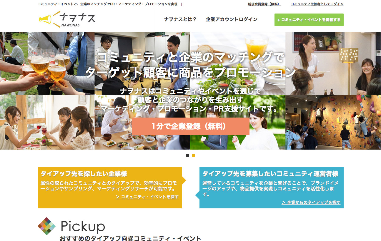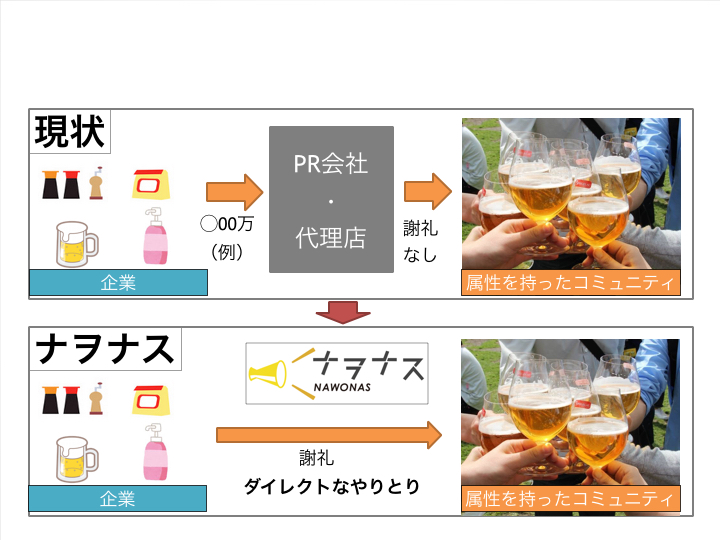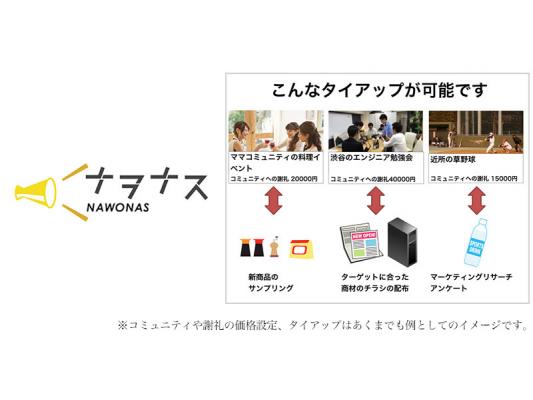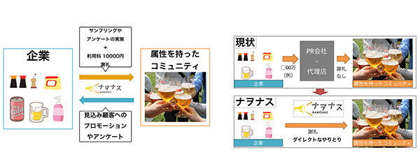 「ナヲナス」では、企業が販売する新商品や新サービスと、性別や嗜好性・ライフスタイルなどの属性が細分化されたコミュニティ、それぞれをご登録いただくことでマッチングすることができます。相互に親和性のあるコミュニティや商品にオファーすることで、企業としては販促やモニタリングの場として、コミュニティ主催者は参加者へのインセンティブとして双方にメリットのあるマッチングを行うことができます。