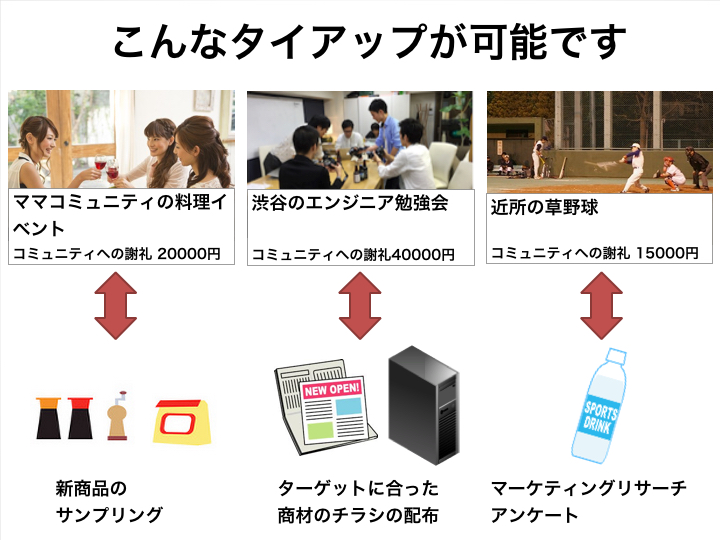 例えば、料理好きの主婦のコミュニティでは調味料や食材などのサンプリング、エンジニアの勉強会やコンペティションではソフトウェアなどの商材を景品として、草野球のチームやランニングサークルには新しいスポーツ飲料の試飲リサーチなど、それぞれのコミュニティに親和性の高いタイアップを行うことにより効率的な販促活動やマーケティングリサーチを可能とします。