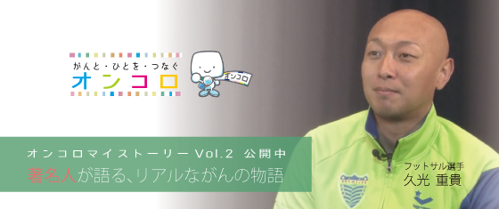 「オンコロマイストーリー」は、著名人が語るリアルながんの物語として、がん経験者の体験談を動画形式でお届けしています。今回は、第一弾 タレントの麻美ゆまさんのインタビューに続く、第二弾として湘南ベルマーレ フットサルクラブで活躍されている久光重貴選手の体験談を掲載しております。久光重貴選手は、Fリーグ(日本のフットサルトップリーグ)でプレーし、フットサル日本代表にも選出された名プレーヤーです。