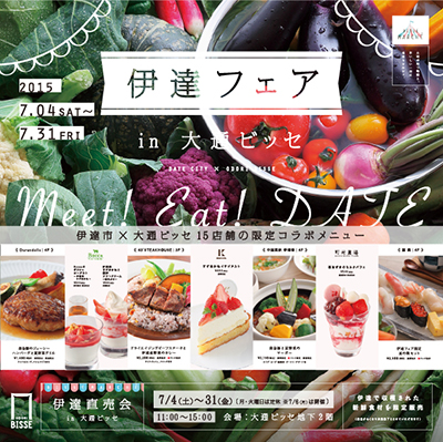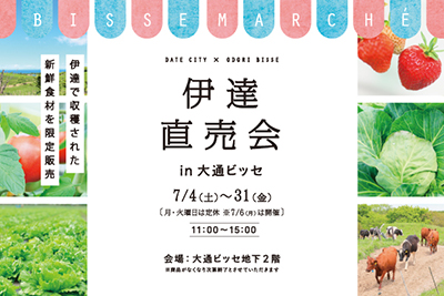 イベント期間中は、伊達のおいしい野菜に牛乳、海の幸とお肉など新鮮なご当地食材を使った限定メニューやスイーツなどを、さまざまなスタイルでお楽しみいただけます。さらに、ご自宅でも伊達のおいしさを満喫していただけるよう、直売会も連日開催します。ぜひ、大通ビッセと伊達市のコラボレーションがお届けする、おいしい「伊達フェア」をご堪能ください。